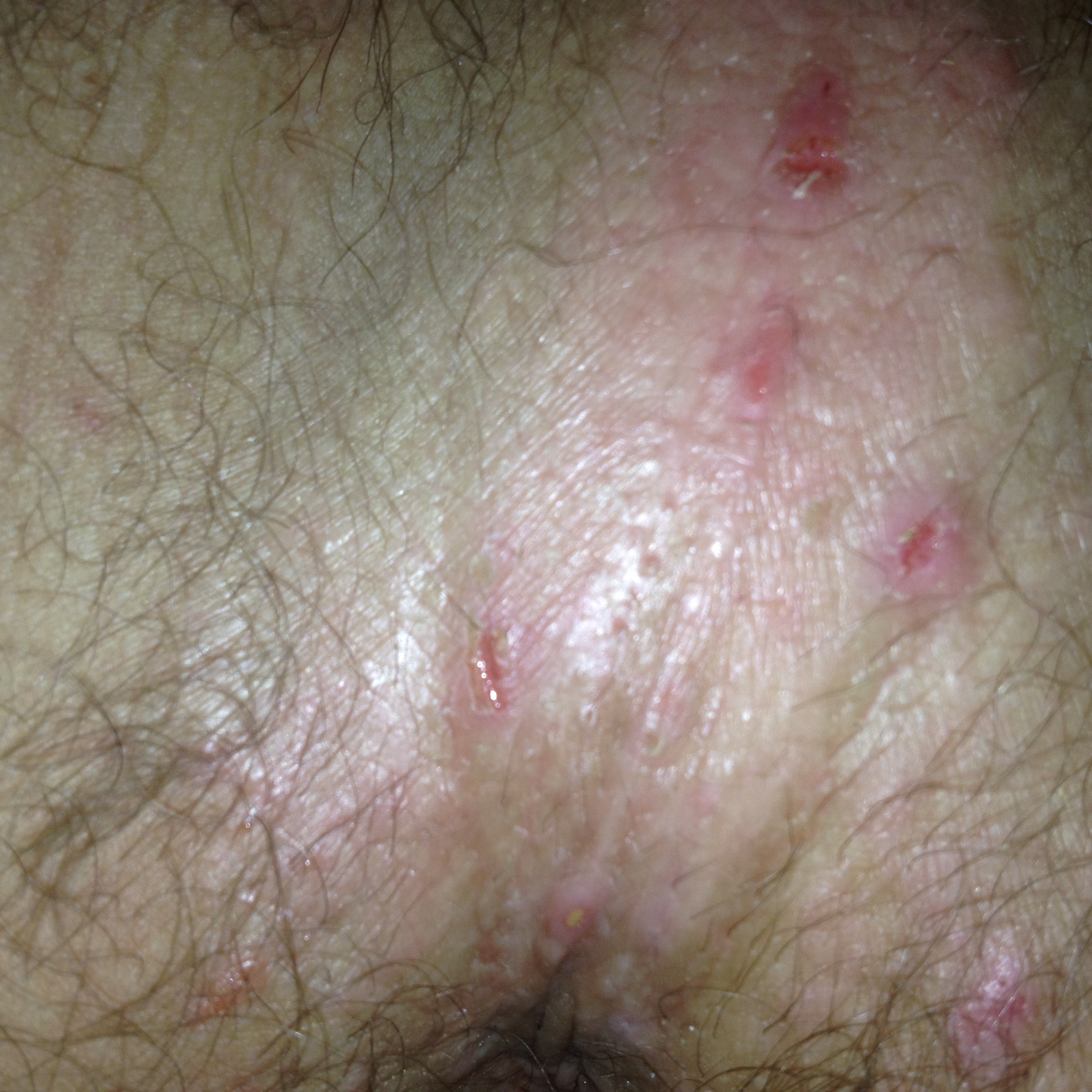 Zřejmě u vás došlo k zapářce a při podrbání jste si takto rozškrabal pokožku mezi šourkem a konečníkem. Druhá možnost je geniální herpes, ale to nelze ze stavu na fotografii s jistotou určit. Nejspíše bude třeba vyzkoušet několik postupů. Sám si můžete pomoci důkladným mytím mýdlem dvakrát denně a vysušením do sucha ručníkem. Po každém mytí je potřeba aplikovat dětský zásyp. Když se to při tomto postupu nezlepší do jednoho týdne, tak bude potřeba zjistit přesnou příčinu těchto problémů v ordinaci kožního lékaře. Tam pak dostanete účinný lék na lékařskýpředpis.
