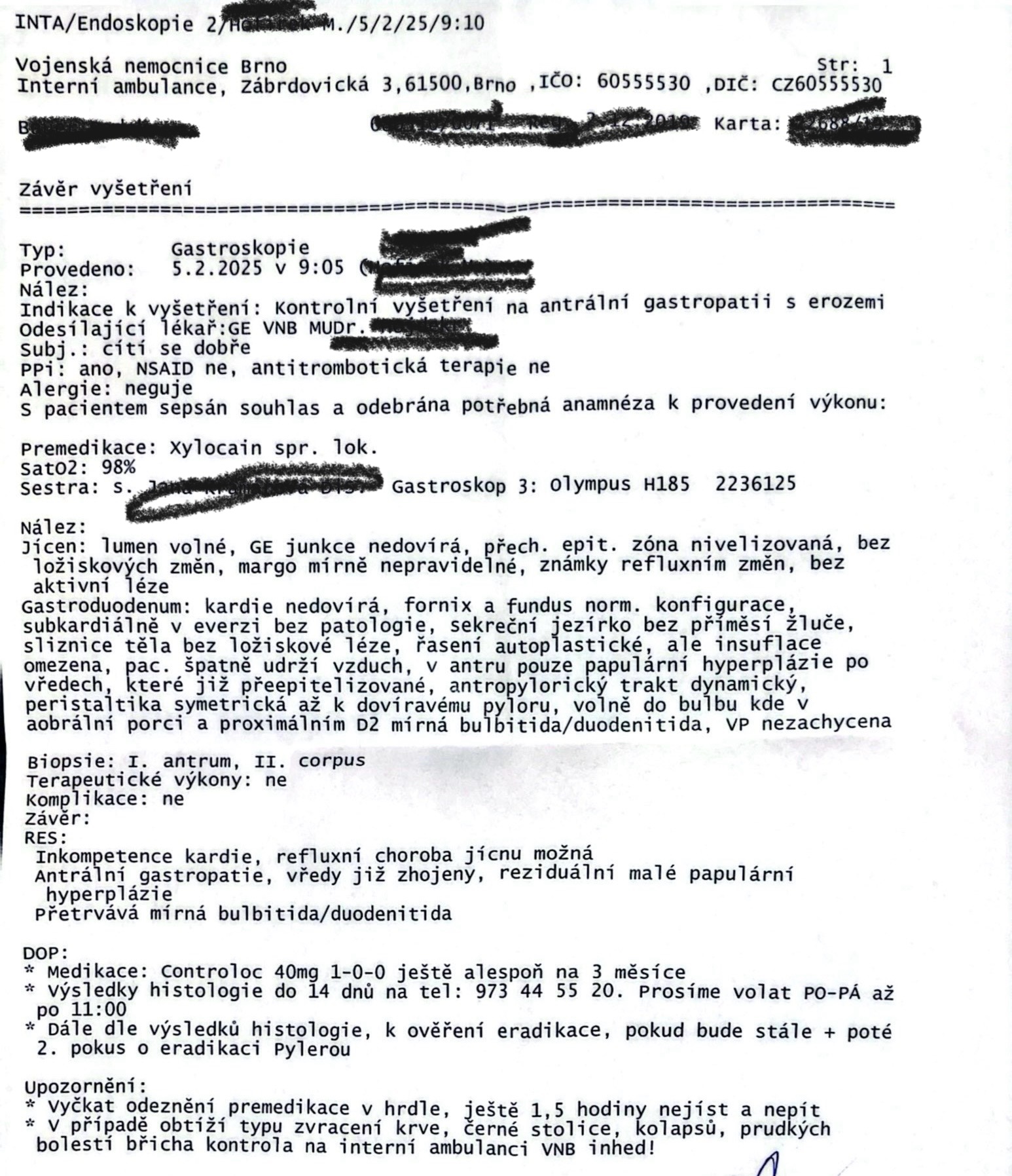 Ze zprávy také vyplývá, že máte již delší dobu zánět na dvanáctníku, který se nedaří zcela vyléčit. Pro volbu další léčby byly odebrány dva vzorky sliznice žaludku a čeká se, až co řekne laboratoř.